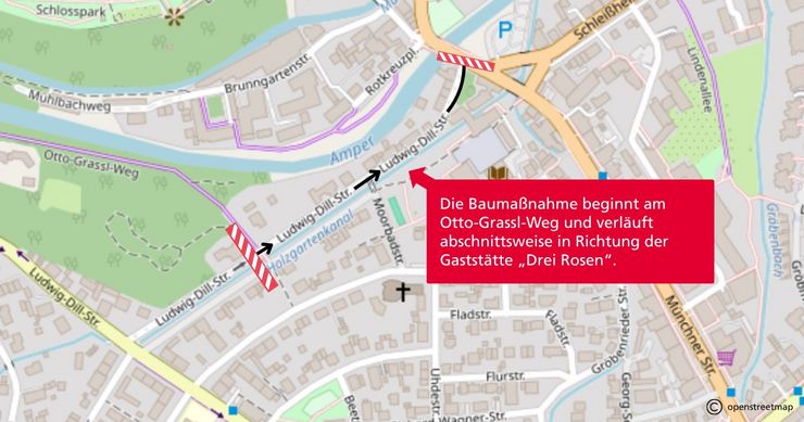 Aufgrund eines Kabelschadens muss in der Ludwig-Dill-Straße ab Montag, 17.11., eine wichtige Stromleitung erneuert werden. Die dafür nötige Vollsperrung für den Durchgangsverkehr erfolgt abschnittsweise: Die Baumaßnahme beginnt am Otto-Grassl-Weg und verläuft in Richtung Gaststätte "Drei Rosen".