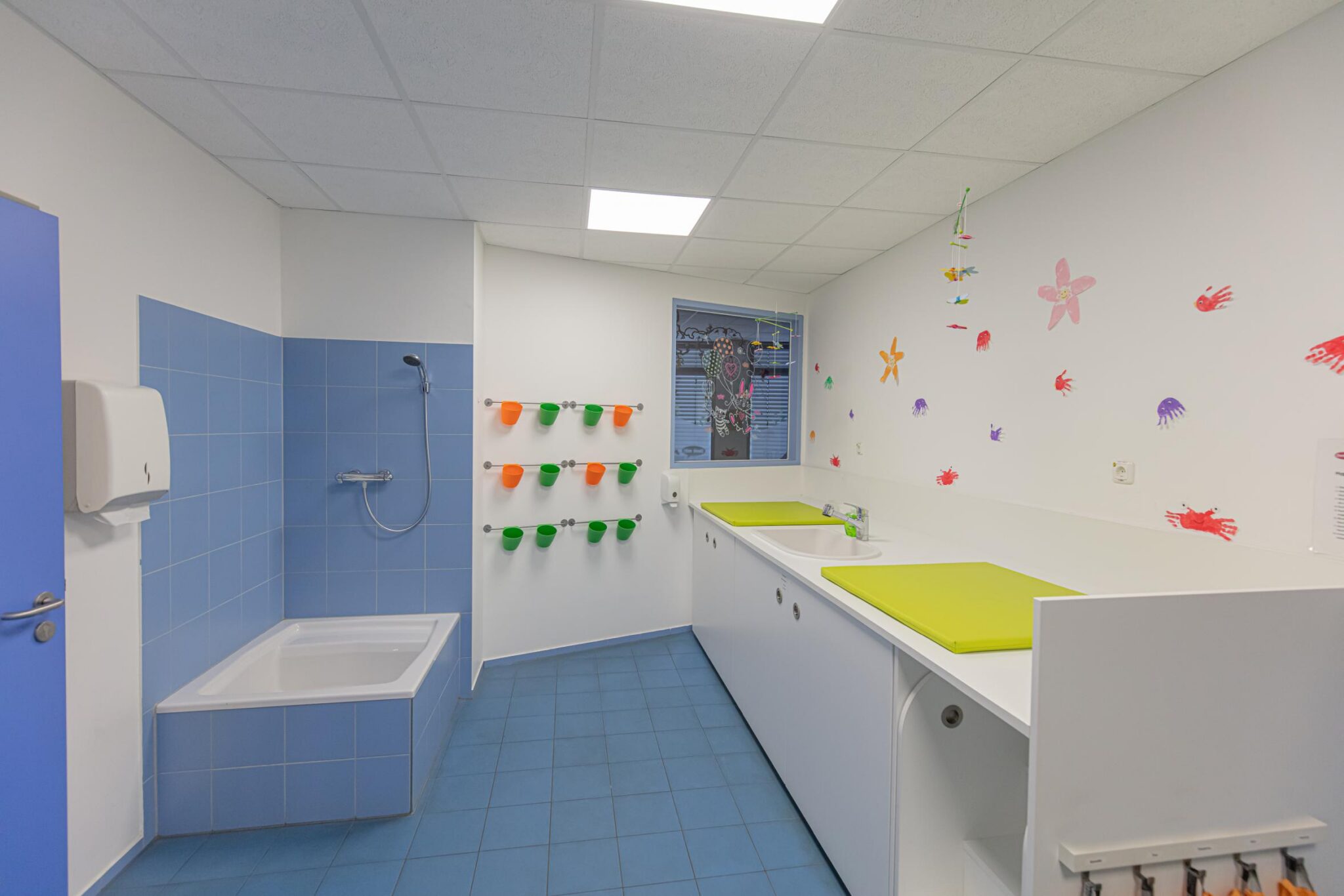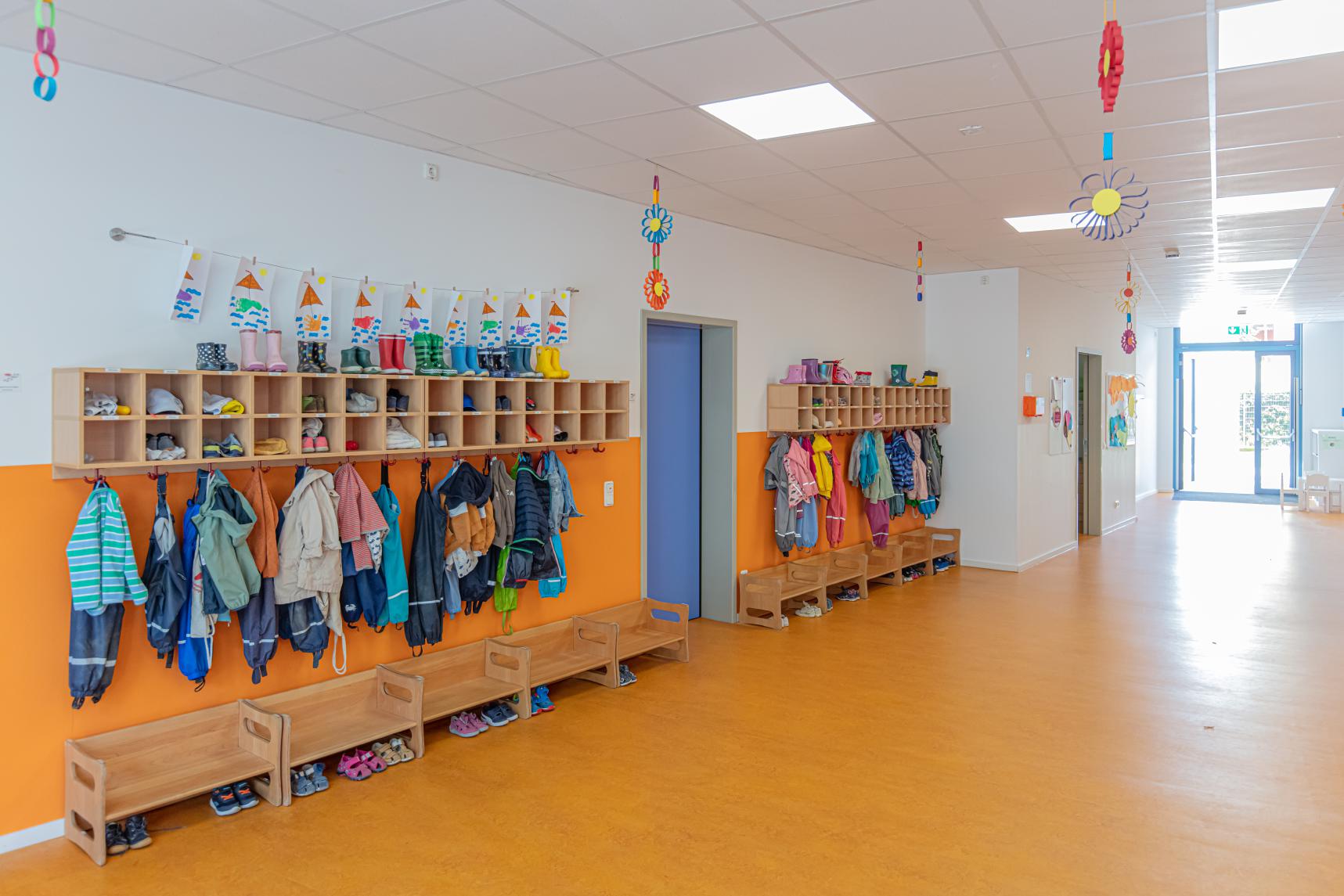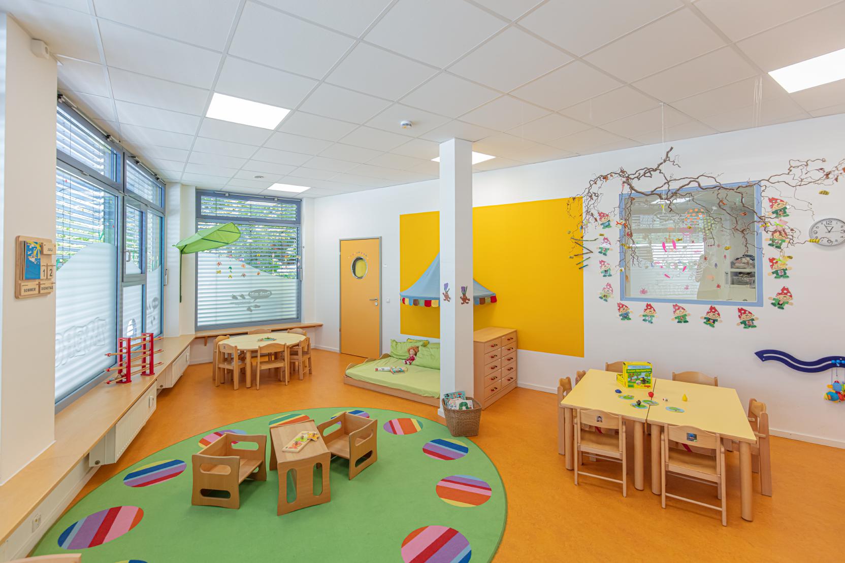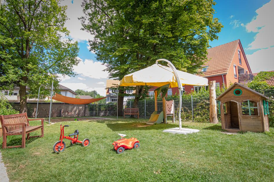 Die Räumlichkeiten wurden entsprechend den Bedürfnissen der Krippenkinder und Kindergartenkinder gestaltet und eröffnen vielfältige Entfaltungsmöglichkeiten. Die freundliche und liebevolle Atmosphäre macht die Kita zu einem Wohlfühlraum für Kinder und Mitarbeiter:innen. Im Garten können sich die Kinder auf verschiedenen Untergründen austoben und im Freispiel oder mit Bewegungsangeboten beschäftigen.