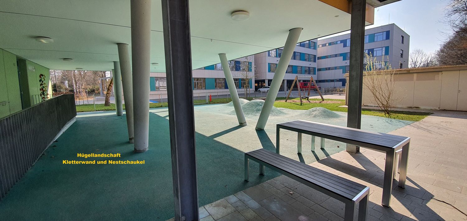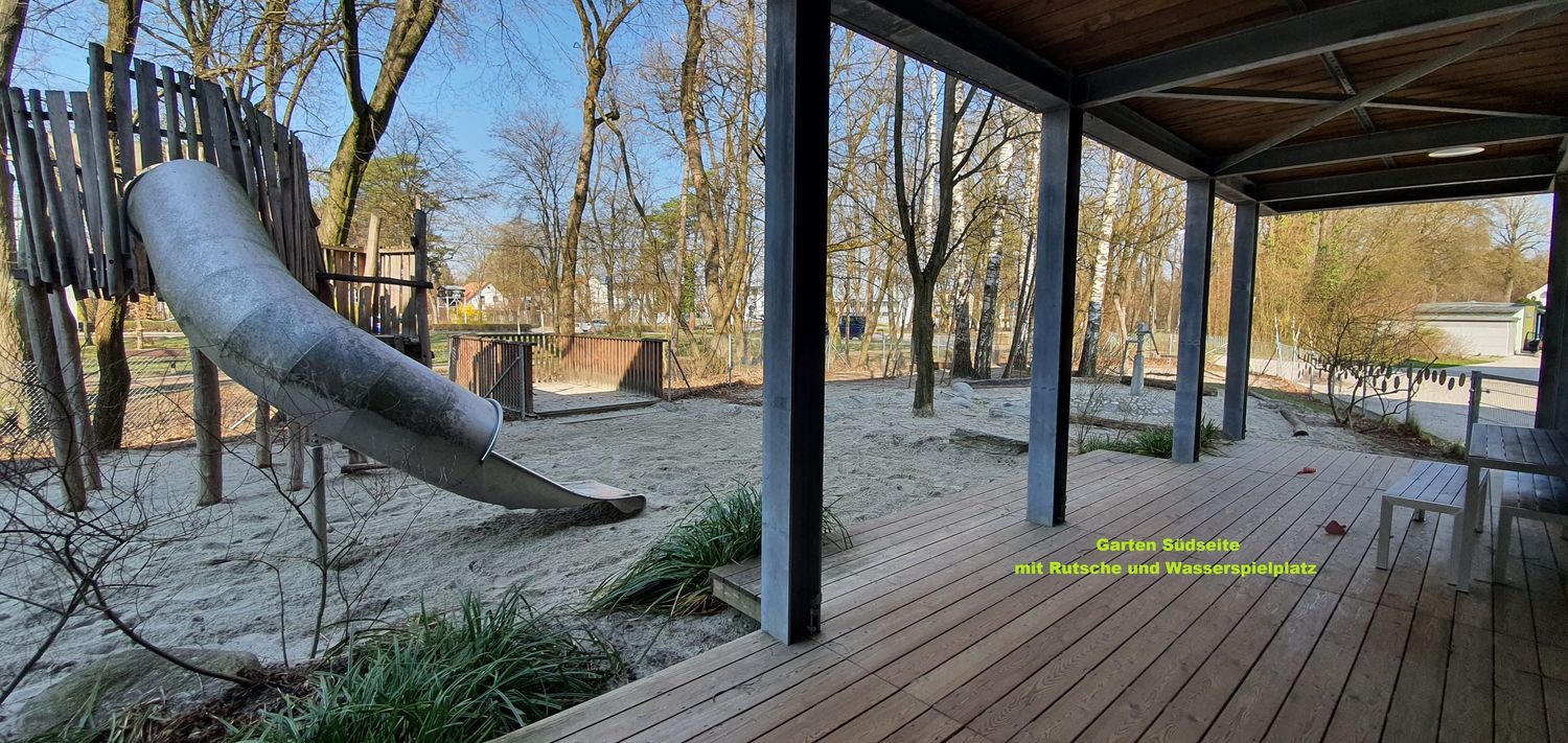 Von den Kindern wird zu jeder Jahreszeit der Garten intensiv genutzt. Das liegt an der teilweise überdachten blauen Hügellandschaft, der großen Sandspielfläche mit einem Wasserspielplatz und verschiedenen Spielgeräten. Auch der Pausenhof kann am Nachmittag von den Kindern genutzt werden.