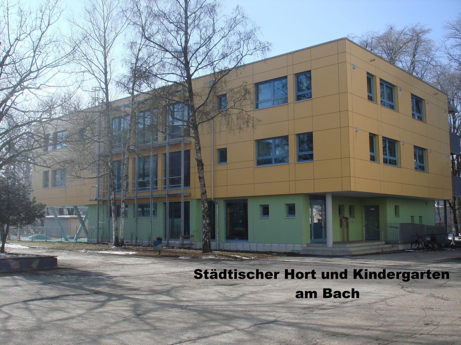Der städtische Hort und Kindergarten "Am Bach" liegt sehr ruhig im Grünen zwischen der Grundschule und der Mittelschule Dachau Süd. Unsere Kindertagesstätte verfügt über zwei Hortgruppen und zwei Kindergartengruppen mit teilgeöffneter Betreuung.