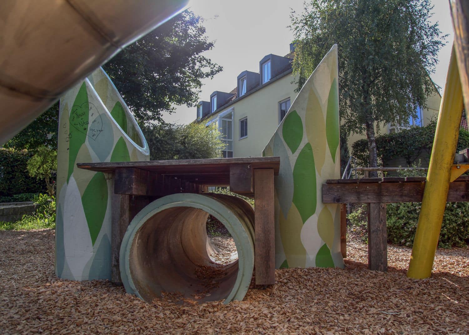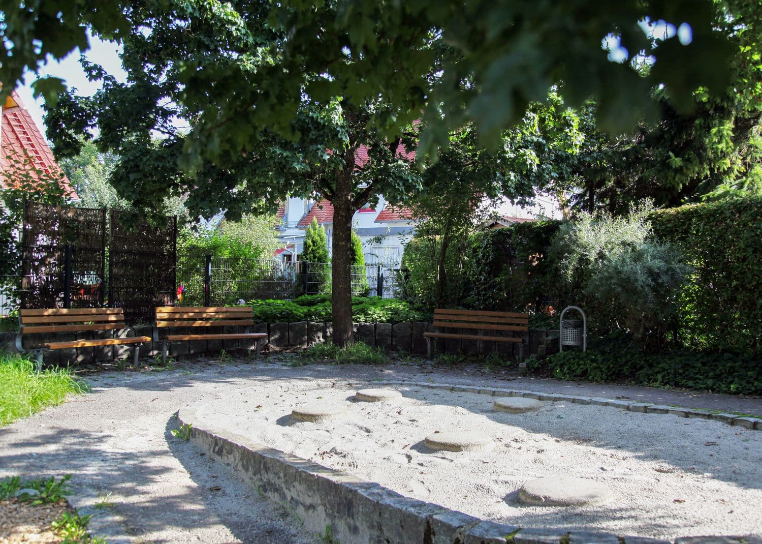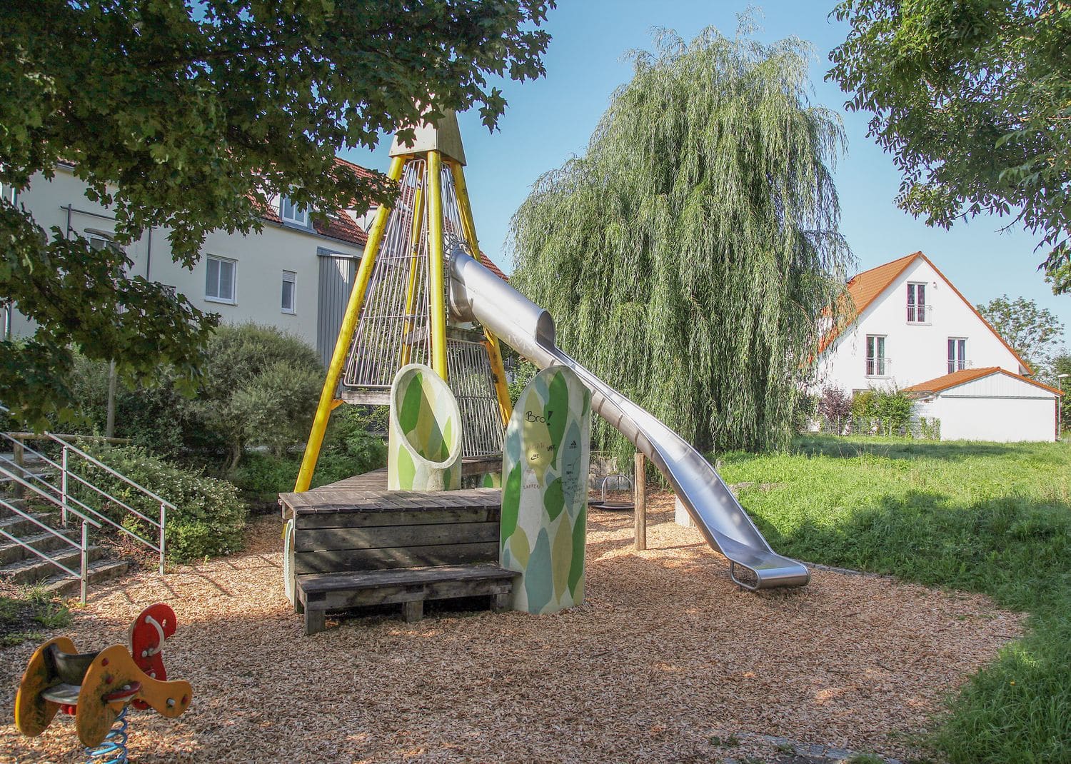 Der kleine Spielplatz an der Emilie-Pelikan-Straße wird vor allem von kleineren Kindern aus den angrenzenden Wohngebieten genutzt. Der auffällige Dalbenturm und eine alte Trauer-Weide prägen das Bild der Spielanlage.