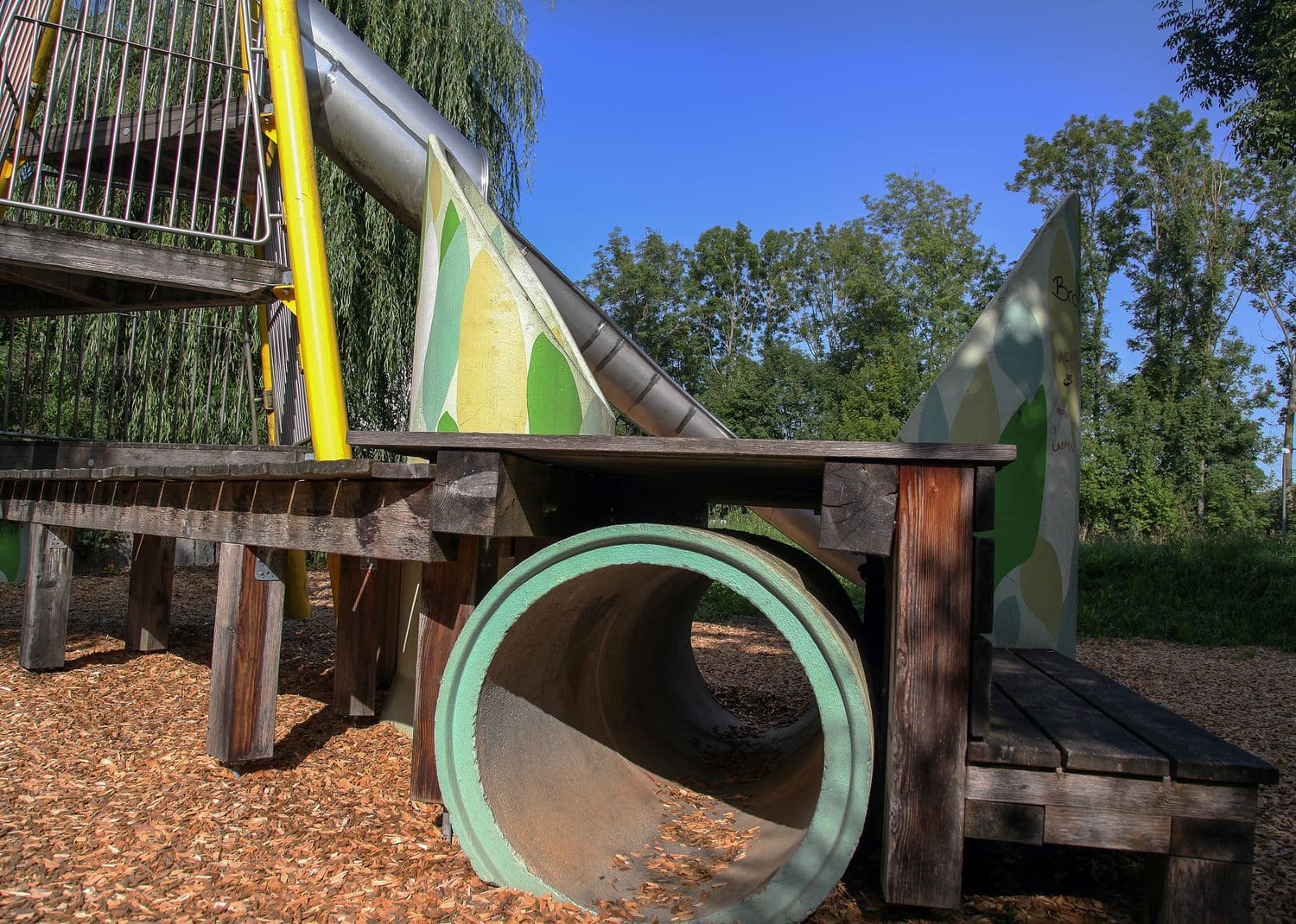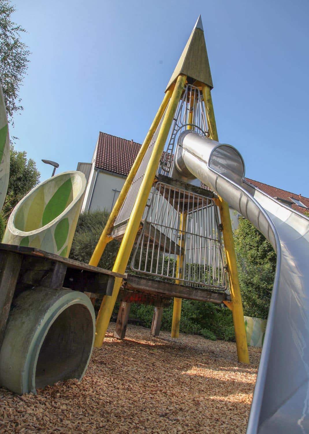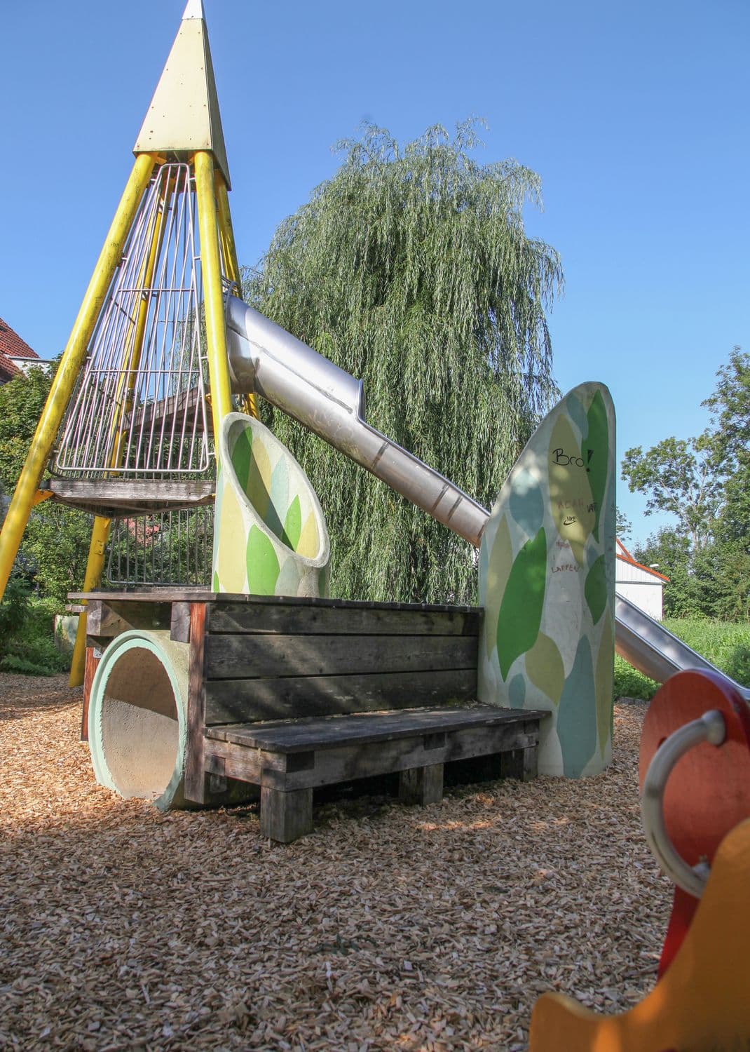 Der kleine Spielplatz an der Emilie-Pelikan-Straße wird vor allem von kleineren Kindern aus den angrenzenden Wohngebieten genutzt. Der auffällige Dalbenturm und eine alte Trauer-Weide prägen das Bild der Spielanlage.