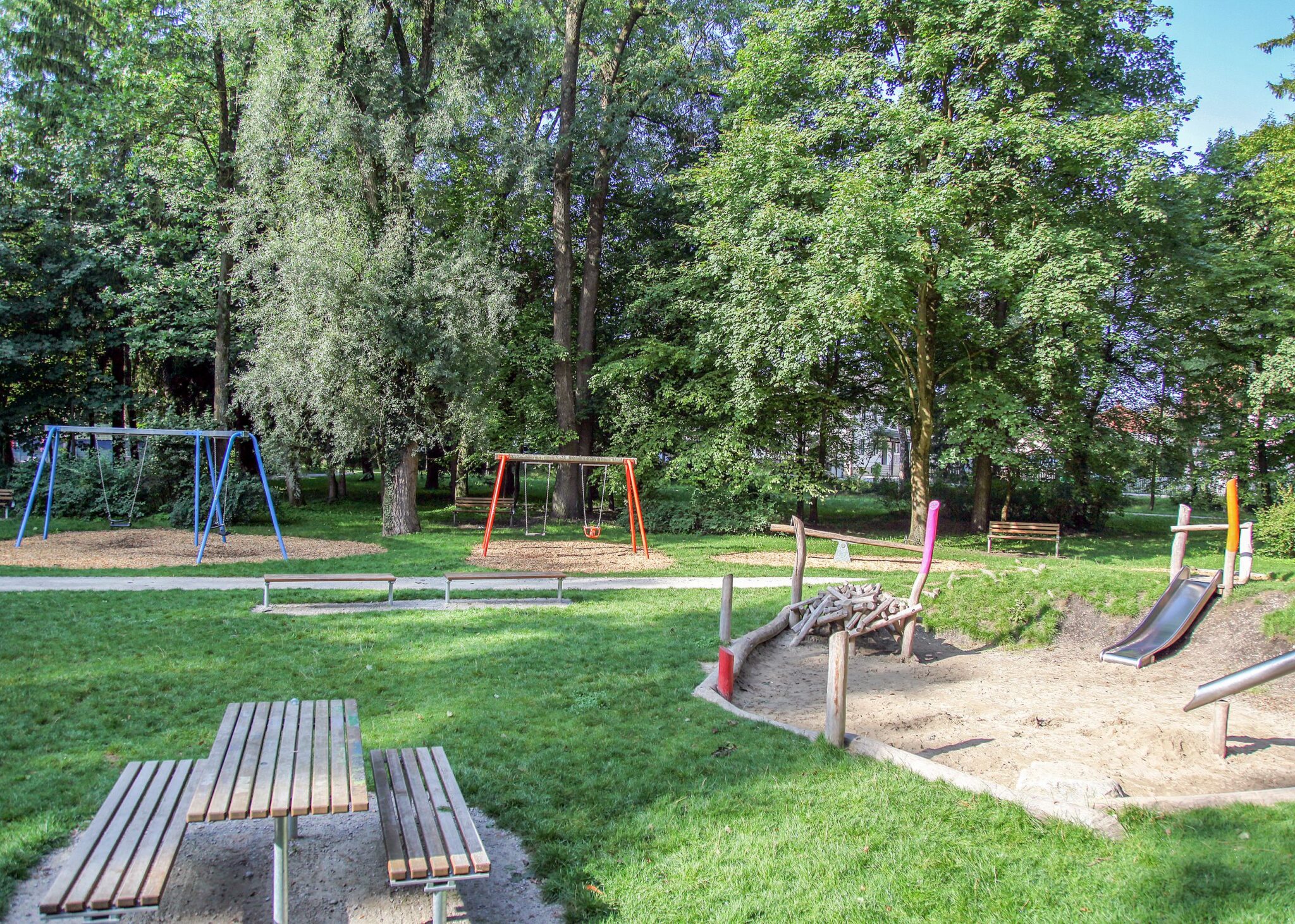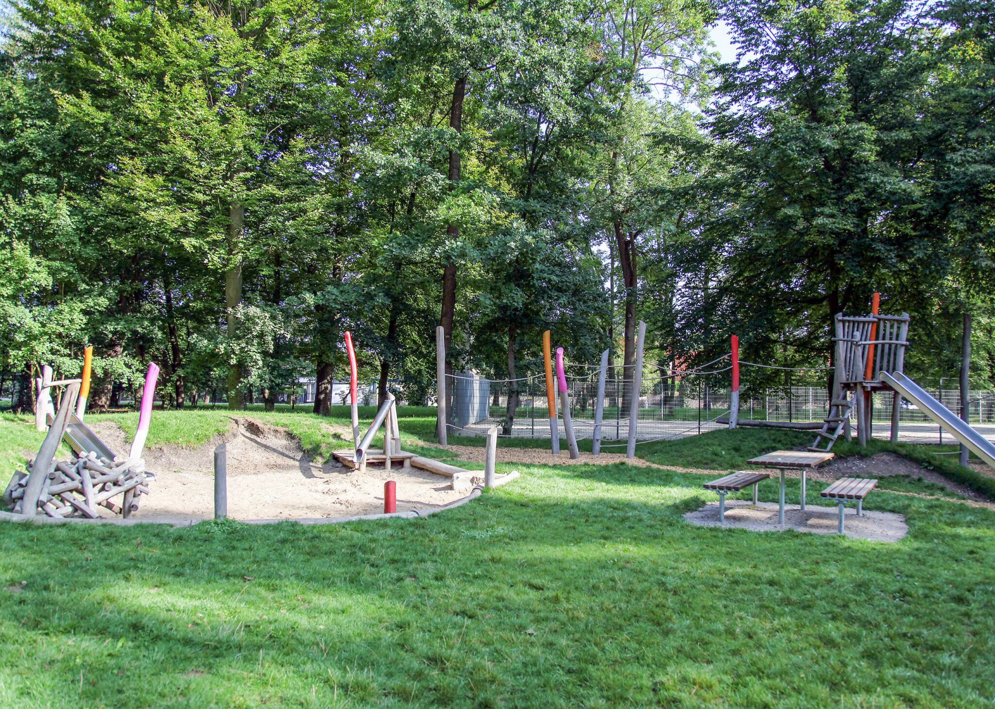 Der Spielplatz ist bei Kindern aller Altersgruppen sehr beliebt. Sie können hier nach Herzenslust toben, balancieren, klettern oder sich auf einer von drei Rutschen vergnügen. Der Spielplatz ist anspruchsvoll und fördert die Kinder so in ihrer Entwicklung. Die große zentrale Spielwiese und der Gehölzbestand bieten genügend Raum für freies Spielen. Für sportliche Aktivitäten bieten sich der angrenzende Bolzplatz, ein Basketballspielfeld und zwei Tischtennisplatten an.