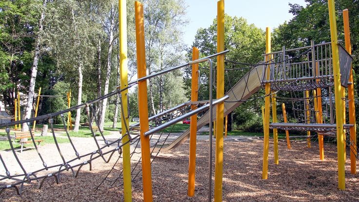 Der Spielplatz liegt in einem für Dachau-Ost bedeutenden Grünzug, sein Bild wird geprägt vom lichten Birkenbestand und den freundlichen, orangen Stangen der Spielgeräte. Zwei gegenüberliegende Spielanlagen bieten verschiedene Bewegungs- und Kletterparcours für größere Kinder und Jugendliche. Kleinkinder nutzen den Sandspielbereich mit Backtisch und Sandschaufel. Verschiedene Bänke, Picknickplätze und Liegen laden zum Verweilen in der Grünanlage ein. Die große Wiese kann zum Toben und für Ballspiele genutzt werden.