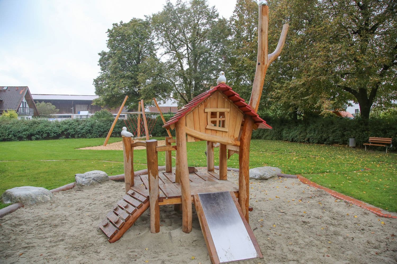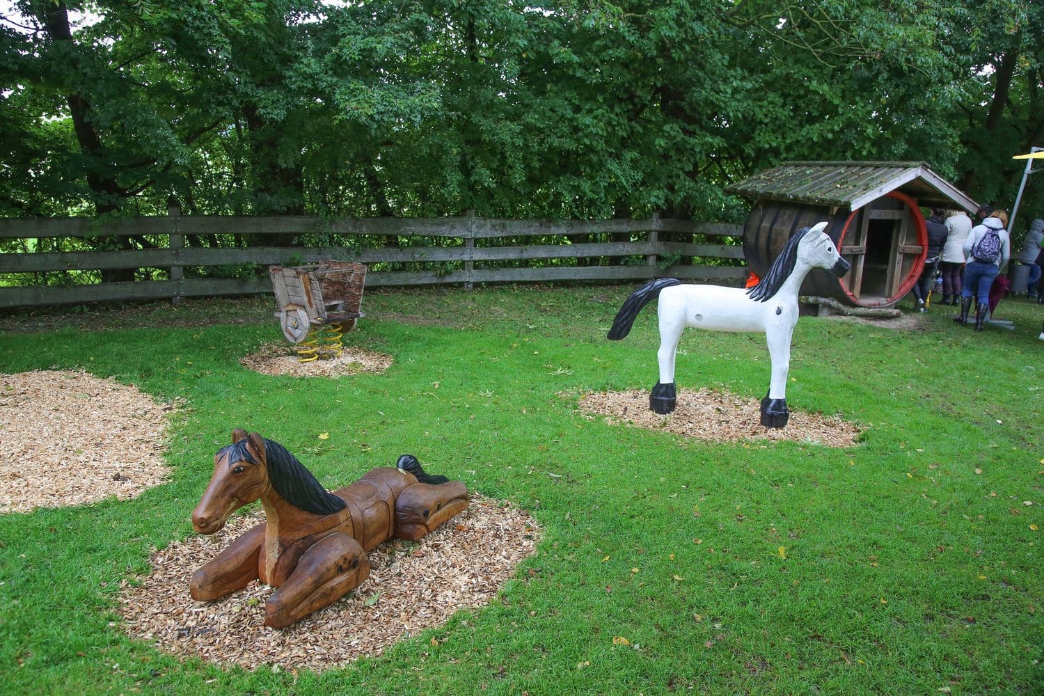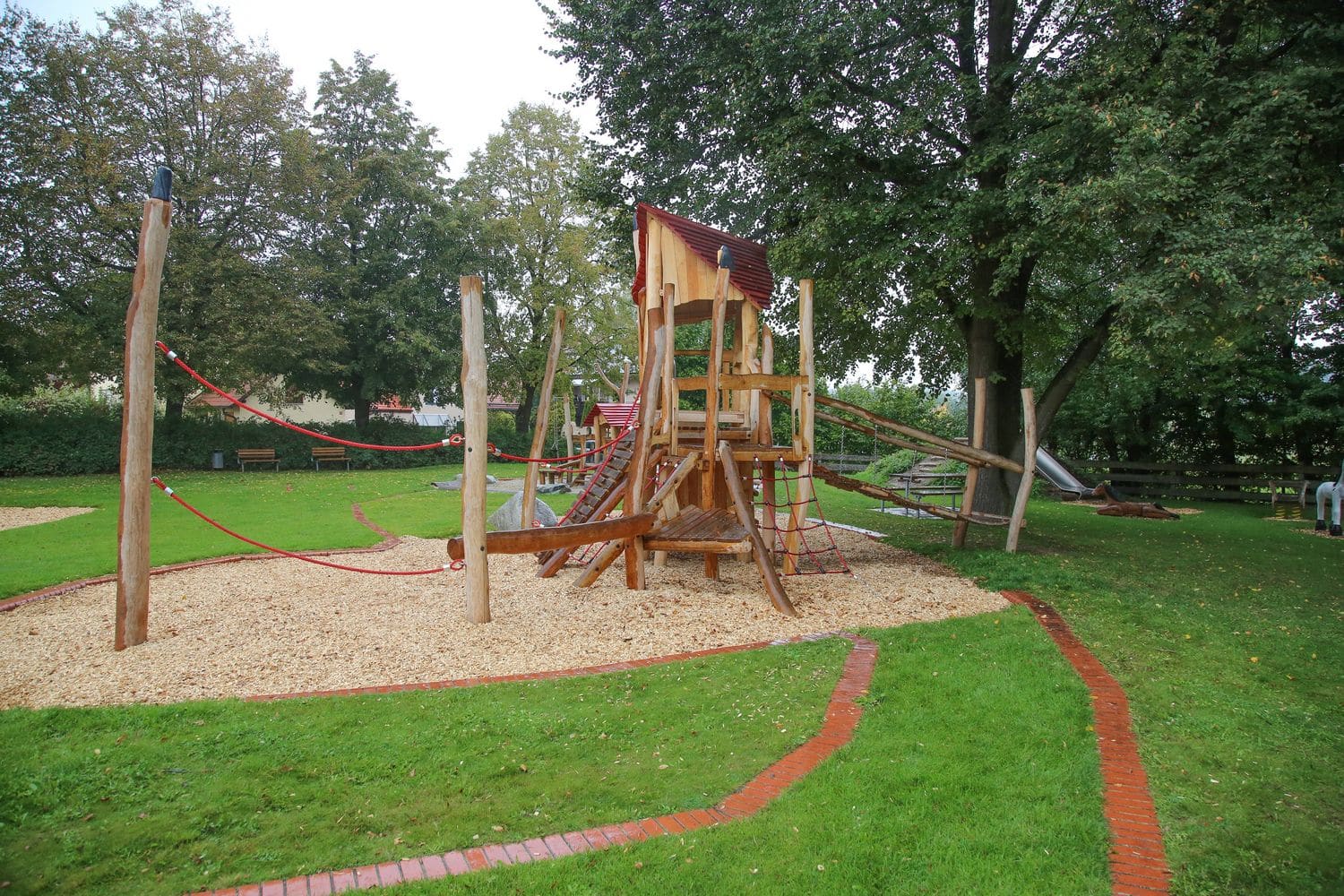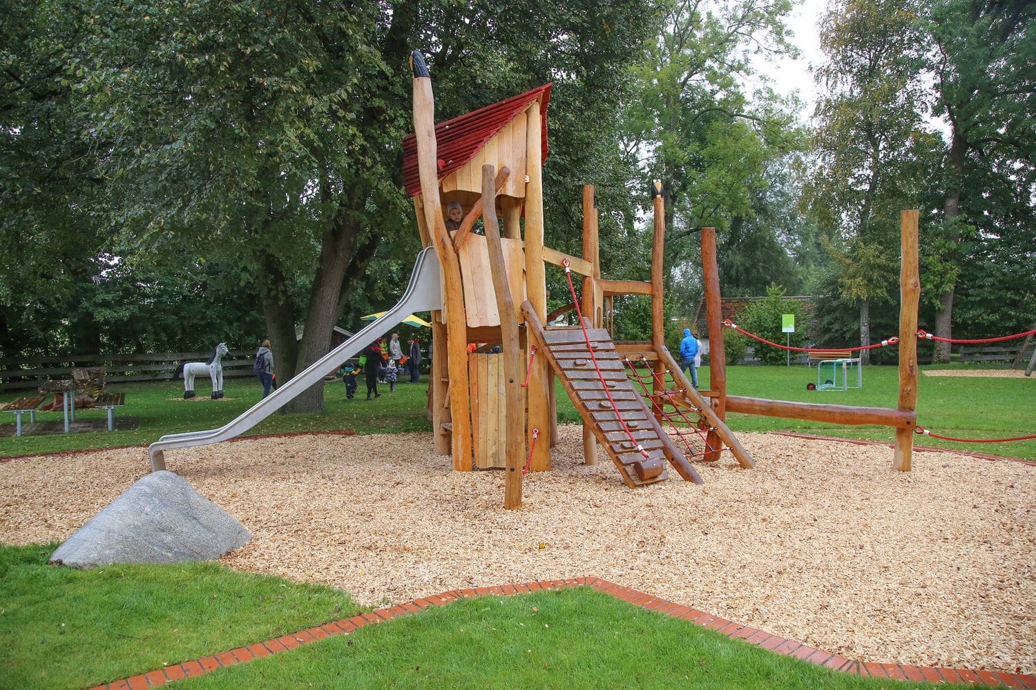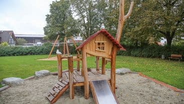 Großzügiger Spielplatz in Pellheim mit schönem Baumbestand, großer Spielwiese und einem vielfältigen Spielangebot für Kinder aller Altersgruppen. Wie auf den umliegenden Pferdekoppeln gibt es auch auf dem Spielplatz (Holz-) Pferdchen.