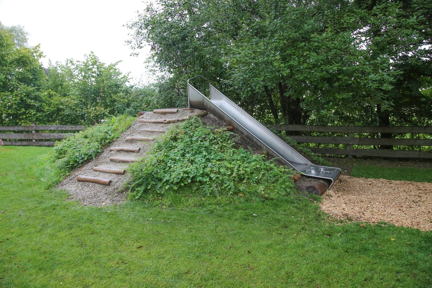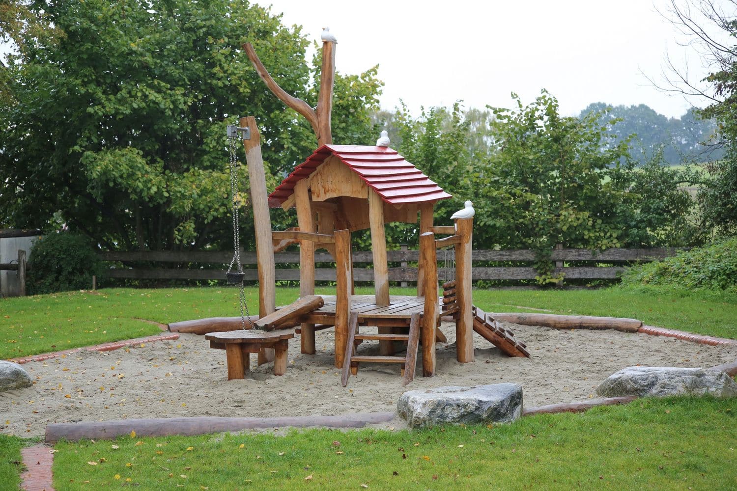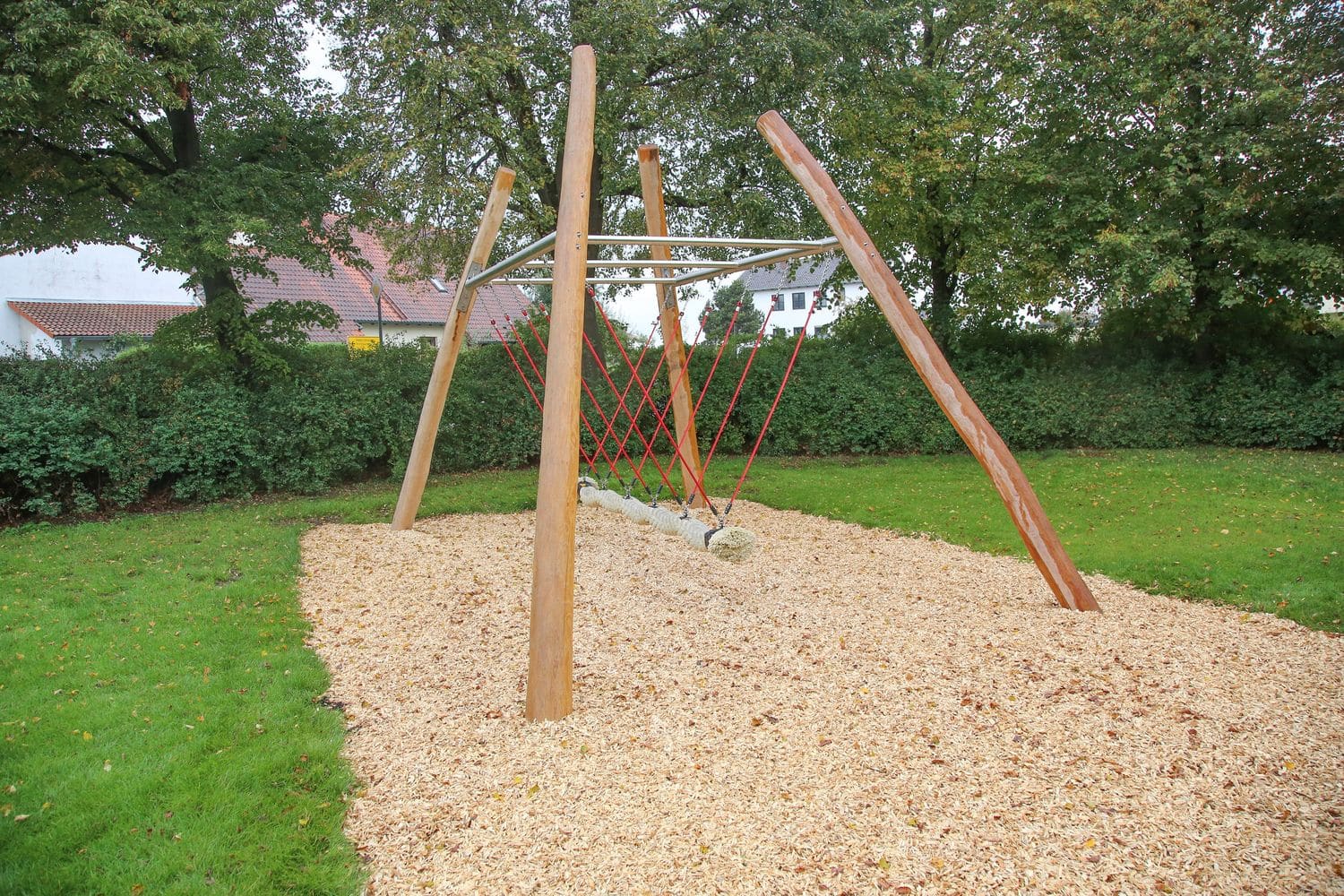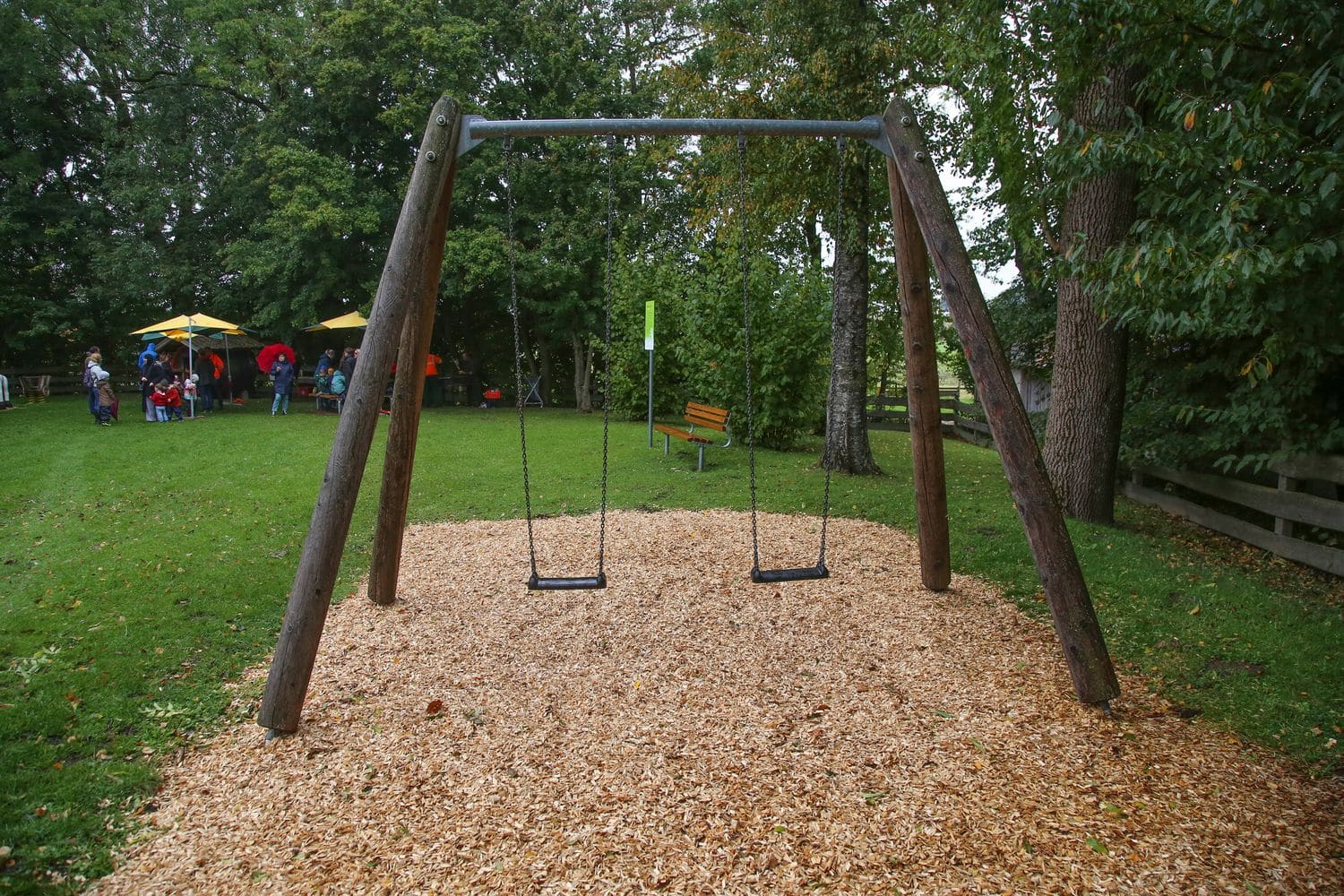 Großzügiger Spielplatz in Pellheim mit schönem Baumbestand, großer Spielwiese und einem vielfältigen Spielangebot für Kinder aller Altersgruppen. Wie auf den umliegenden Pferdekoppeln gibt es auch auf dem Spielplatz (Holz-) Pferdchen.