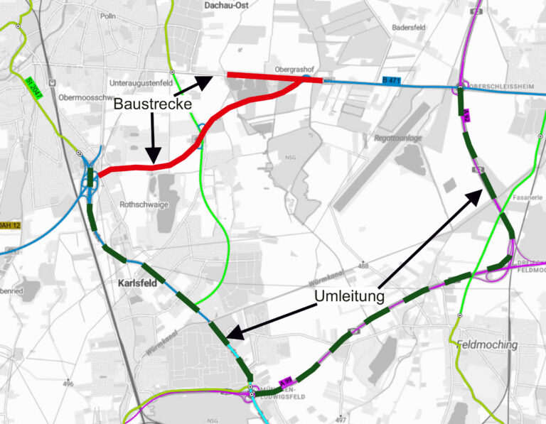 Ab Montag, 4. Mai, ist die Fahrbeziehung Dachau ‑ Oberschleißheim über die Schleißheimer Straße und die B 471 in beiden Fahrtrichtungen wieder befahrbar. Die Terminierung am Maifeiertag und dem anschließenden Wochenende soll die Beeinträchtigungen für den werktäglichen Berufsverkehr möglichst geringhalten. Die Stadt Dachau nutzt die Vollsperrung für eine Erhaltungsmaßnahme auf der Schleißheimer Straße vom Knotenpunkt Obergrashof kommend stadteinwärts bis zur Brücke über den Saubach.