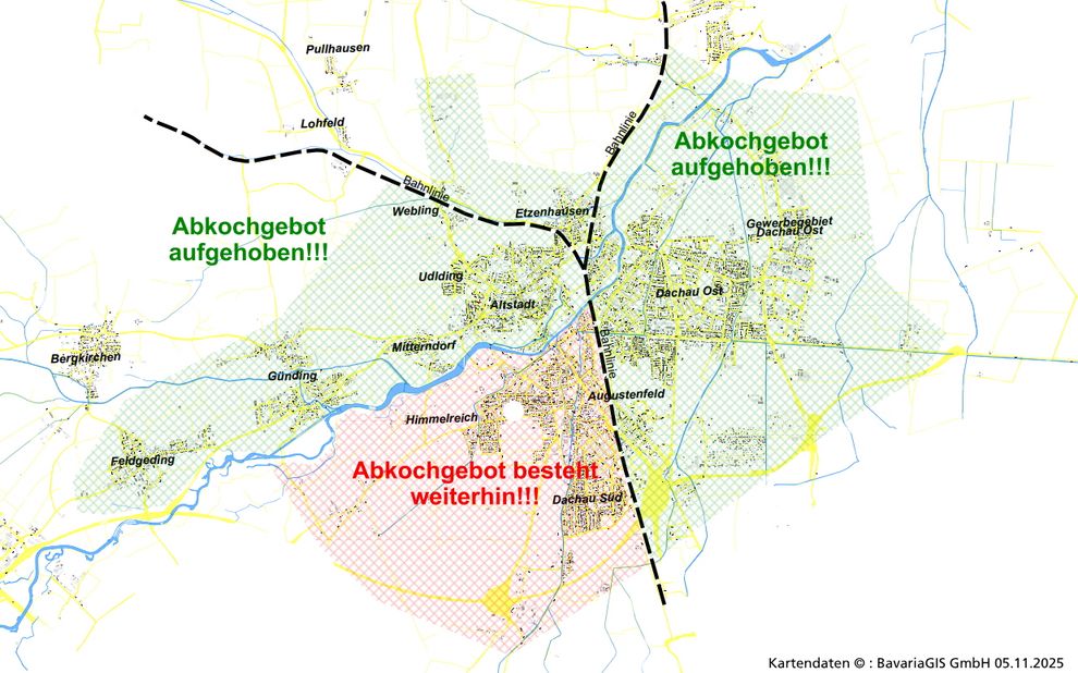 - Für die auf der Karte rot eingefärbten Bereiche westlich der Bahnlinie und südlich der Amper bleibt das Abkochgebot vorerst bestehen.