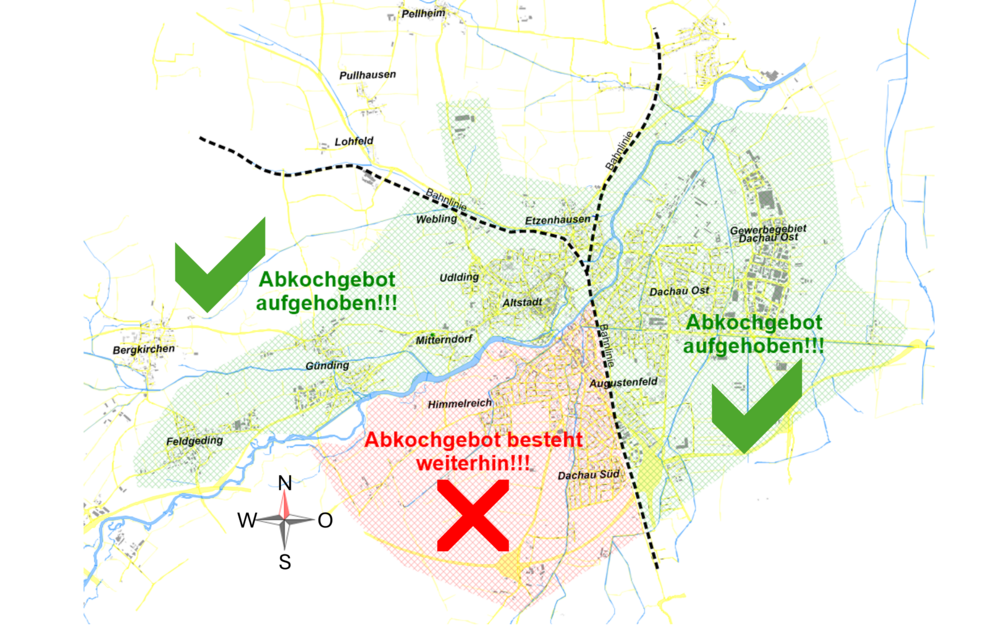 Die Stadtwerke Dachau informieren: Das vorsorgliche Abkochgebot kann noch nicht vollständig aufgehoben werden. In den Bereichen westlich der Bahnlinie und südlich der Amper zeigt die aktuelle Beprobung weiterhin eine geringe Anzahl coliformer Keime, die jedoch weiter rückläufig ist.